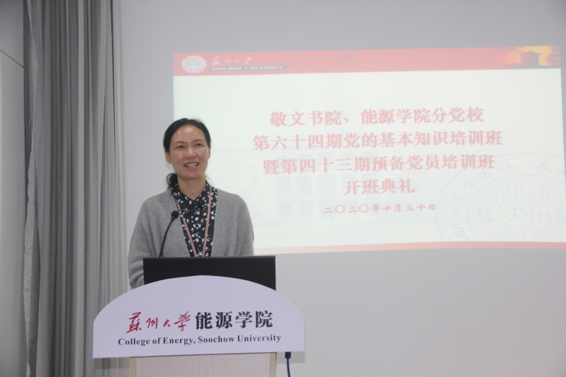 2020年10月30日晚,在能源学院新能源大楼115报告厅,能源学院、敬文书院分党校联合举办了2020年下半年第64期党的基本知识培训班、第四十三期预备党员培训班开班典礼暨第三期读书共建活动开幕式。能源学院党委书记沙丹丹老师、敬文书院党委副书记、副院长孟玲玲老师、敬文书院分党校指导老师孙正嘉老师、能源学院分党校指导老师孙放老师以及能源学院、敬文书院本期分党校培训班全体学员参加了此次活动。