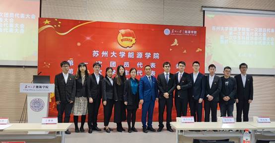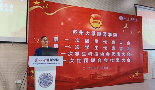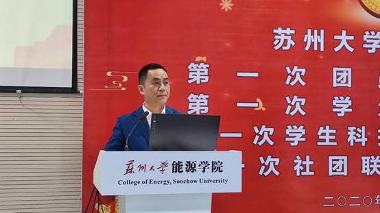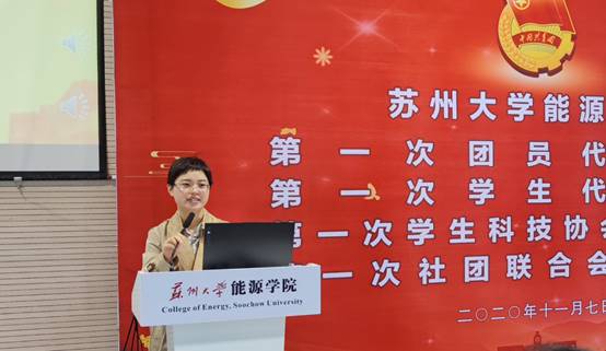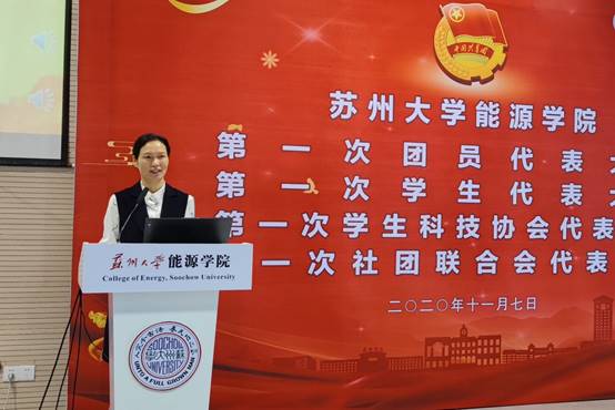 于潜驰书记代表校团委向本次大会的胜利召开表示祝贺。首先,她高度肯定了学院团委的工作,并感谢学院领导、老师和广大团员青年对我校共青团工作的支持,她说:“能源学院虽然人数不多,但在志愿服务领域表现非常突出,形成了自己的品牌。”于书记还特别提出能源学院的小青柠、小雏菊、小太阳、朵儿计划等公益组织,赞赏了他们在关爱白血病儿童、关爱老人、支教扶贫等领域的大胆尝试和无私奉献。于书记还对学院各学生组织提出了“四点希望”——第一,希望大家坚定信念,成为奔涌的最强后浪;第二,希望大家勤于学习,成为全面发展的人才;第三,希望大家牢记使命,做有担当的青年;第四,希望大家勇于创新,为新时代的大厦添砖加瓦。